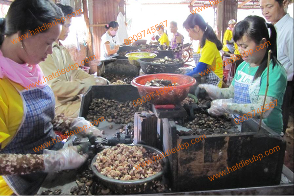Hạt điều sau khi hấp xong sẽ được đưa đến các bạn công nhân thực hiện tách lớp vỏ cứng bên ngoài để lấy nhân. Quy trình này tốn khá nhiều công sức, cần sự khéo léo để nhân hạt điều không bị vỡ.